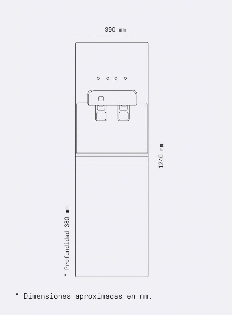 InstalaciónsencillaRecambiomuy sencilloRechazomínimoMembranaultrafiltración. (FRO1064)Fuente de alimentación220~240V~. 50/60 HzCorriente nominal0,6A.Potencia de calentamiento450-550WPotencia de refrigeración100WRefrigeranteR-600a (19g)Agua aplicableAgua municipalCapacidad depósito agua fría5,5LCapacidad depósito agua caliente1,8LPrefiltropolipropileno de 2,5” espiga 1⁄4Prefiltrocarbón 2,5” espiga 1⁄4Postfiltrocarbón 2,5” espiga 1⁄4Dimensiones390 x 1240 x 380mmShare