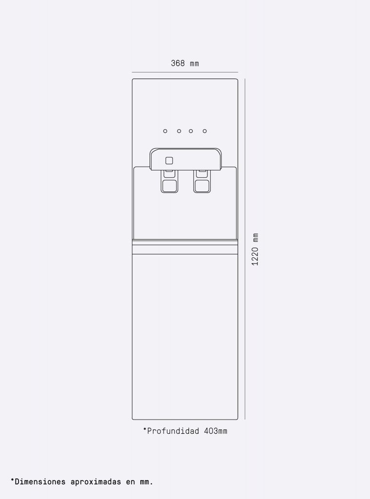 InstalaciónsencillaRecambiomuy sencilloRechazomínimoMembranaultrafiltración. (FRO1064)Fuente de alimentación220~240V~. 50/60 HzCorriente nominal0,6A.Potencia de calentamiento450-550WPotencia de refrigeración100WRefrigeranteR-600a (19g)Agua aplicableAgua municipalCapacidad depósito agua fría5,5LCapacidad depósito agua caliente1,8LPrefiltropolipropileno de 2,5” espiga 1⁄4Prefiltrocarbón 2,5” espiga 1⁄4Postfiltrocarbón 2,5” espiga 1⁄4Dimensiones1220 x 368 x 403 mmShare